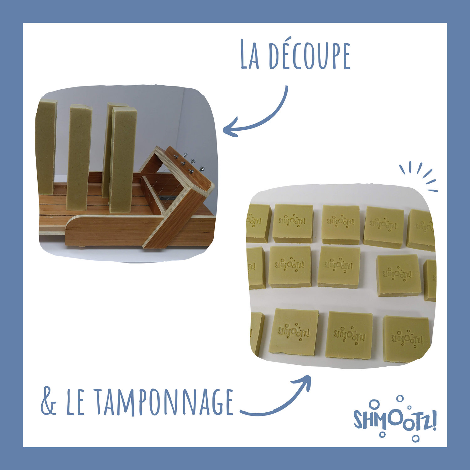 Environ 24 heures plus tard, on passe au démoulage et pour les savons de 100 grammes, à la découpe et au tamponnage !
