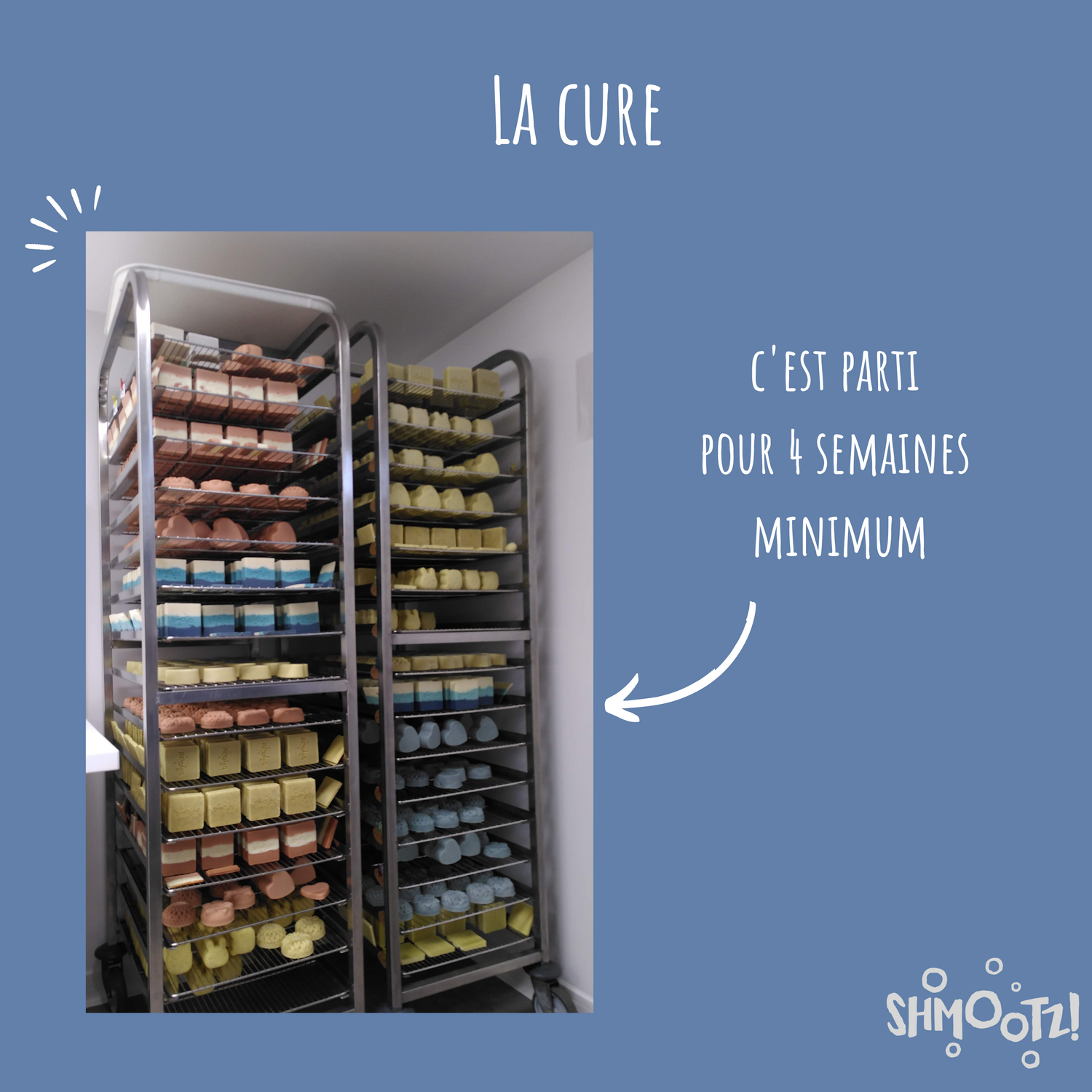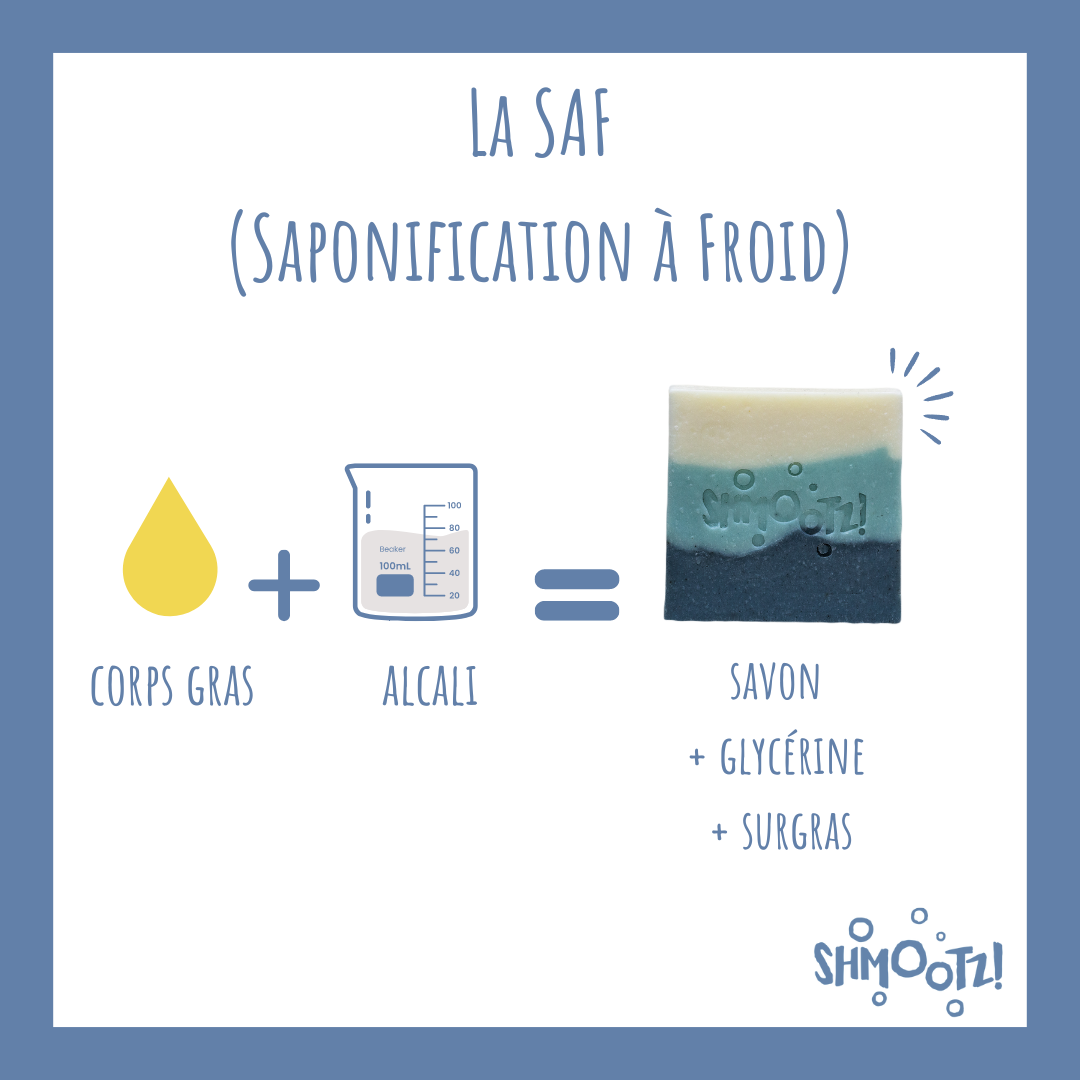 Les savons solides sont fabriqués selon la méthode de la saponification à froid (SAF pour les intimes). Le principe est simple: un corps gras + un alcali = du savon et de la glycérine ! Si la quantité d'alcali est réduite par rapport à la quantité de corps gras à saponifier, alors, le savon est surgras, comme tous les savons SHMOOTZ !